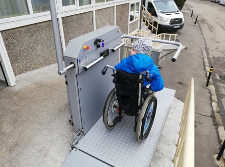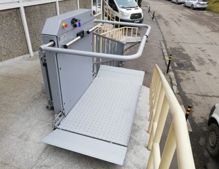 Door de toegenomen aantal cliënten (ook met rollend vervoer) en om het personeel te ontlasten is er besloten op één van de twee toe-gangstrappen een rolstoelplateaulift te installeren. Dit Duitse product is door een Roemeens bedrijf geïnstalleerd. Zij zijn ook verantwoorde-lijk voor het onderhoud.