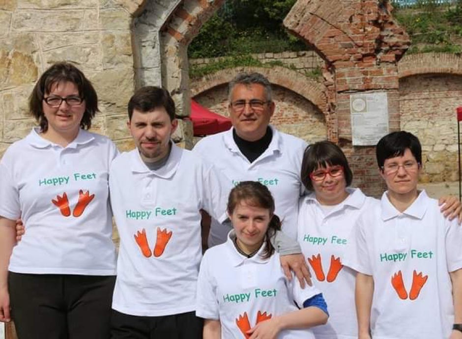 Als blijkt dat een aantal cliënten muzikale kwaliteiten hebben wordt een muziekgroep opgericht. De groep krijgt de naam Happy Feet, mede gebaseerd op de beweeglijkheid van een aantal leden. De groep bestaat uit 5 cliënten en twee muzikale begeleiders. Één met keyboard en één achter het mengpaneel. Ze treden met grote regelmaat op. De optredens zijn voornamelijk tijdens activiteiten ter promotie van Alpha maar ook in gelegenheden om te laten zien en horen dat (en dat weegt in Roemenië nog zwaarder dan in Nederland) dat mensen met een beperking wel degelijk nog kwaliteiten hebben. Op de foto, de derde van links, Laura, is inmiddels toegetreden tot de organisatie United by Music Romania, een wereldwijde omvattende organisatie die tot doel heeft personen met een beperking muziek te laten maken. Laura is tevens werkzaam in de Alpha keuken en een volwaardig lid van het keukenteam.